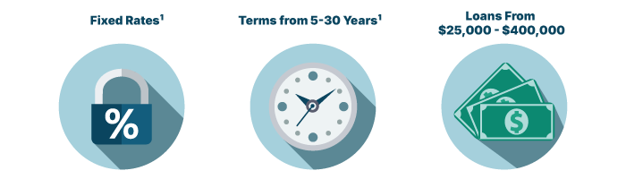 1. Rates effective as of 4/29/2025 are subject to change without notice. Annual Percentage Rate (APR) is subject to change without notice. Restrictions and additional charges may apply. Pre-payment penalty of 1% of unpaid balance during the first year. Cures to offset charges may apply. Title Insurance required on loans greater than $300,000. Texas is not eligible for this offer. Pricing adjustments may apply. Home Equity terms available from 5 to 30 years (60 to 360 months). Monthly payment amounts and interest rates vary based on various factors including loan amount, repayment terms, and creditworthiness. As an example, a $75,000 loan at 7.49% APR for 15 years would result in 180 monthly payments of $694.84. Requirements for the 7.49% APR include minimum credit score of 700, maximum debt-to-income ratio of 45%, and a combined loan-to-value that does not exceed 80%. Payment disclosed does not include taxes and insurance; therefore, the actual payment may be greater.